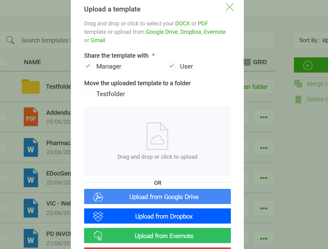 Click on the "Generate" button against the uploaded template. This opens the document generation options pop-up. Select the “Upload data" option. You can populate JSON data as-is without any costly data transformations.