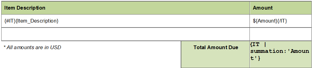 If you are populating XML/JSON data into a table, the system can compute the sum for the table values. Add tags to your template, as shown below. The table is named 'IT', and we need to compute the sum for the 'Amount' column.